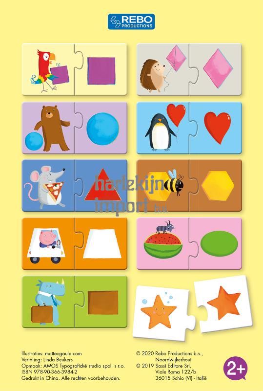 Leer alles over vormen met hulp van je dierenvriendjes! In deze box met hengsel om overal mee naar toe te nemen vind je een kartonnen boekje en 10 puzzels van 2 stukjes voor de leeftijd vanaf 2 jaar.