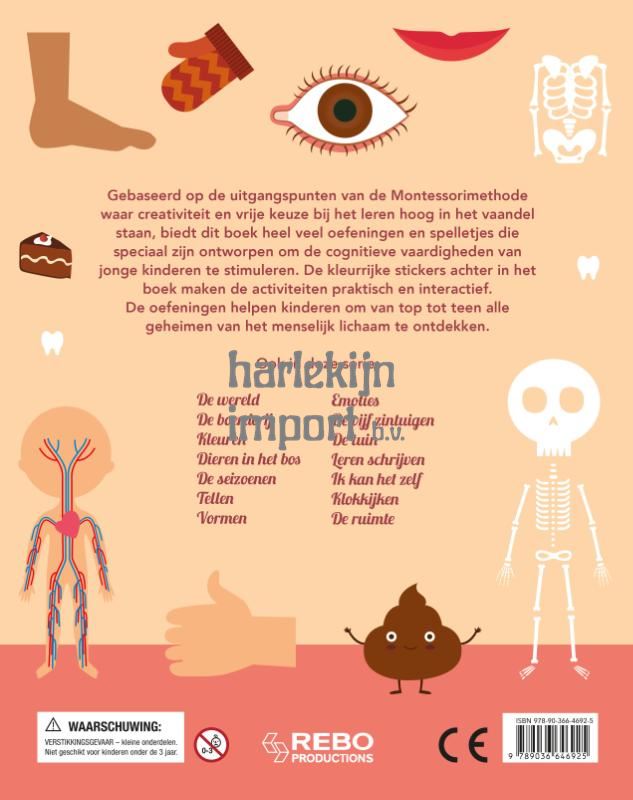 Gebaseerd op de uitgangspunten van de Montessorimethode waar creativiteit en vrije keuze bij het leren hoog in het vaandel staan, biedt dit boek heel veel oefeningen en spelletjes die speciaal zijn ontworpen om de cognitieve vaardigheden van jonge kinderen te stimuleren. De kleurrijke stickers achter in het boek maken de activiteiten praktisch en interactief. De oefeningen helpen kinderen om van top tot teen alle geheimen van het menselijk lichaam te ontdekken.