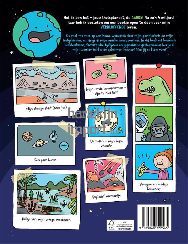 Hoi, ik ben het – jouw thuisplaneet, de AARDE! Na zo’n 4 miljard jaar heb ik besloten om een boekje open te doen over mijn VERBLUFFENDE leven. Ga met me mee op een heuse wereldreis door mijn geschiedenis en mijn leefgebieden, en langs al mijn unieke levensvormen. In dit boek vol boeiende beeldverhalen, fantastische tijdlijnen en gigantische gastoptredens leer je al mijn wereldschokkende geheimen kennen! Ben jij er klaar voor?