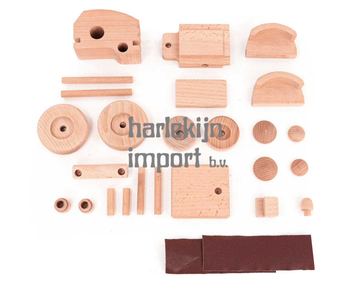 Tijdens het spelen kunnen kinderen proberen de onderdelen te sorteren, te schuren, in elkaar te zetten en aan elkaar te lijmen. Ze kunnen de onderdelen ook schilderen of op welke manier dan ook aanpassen.