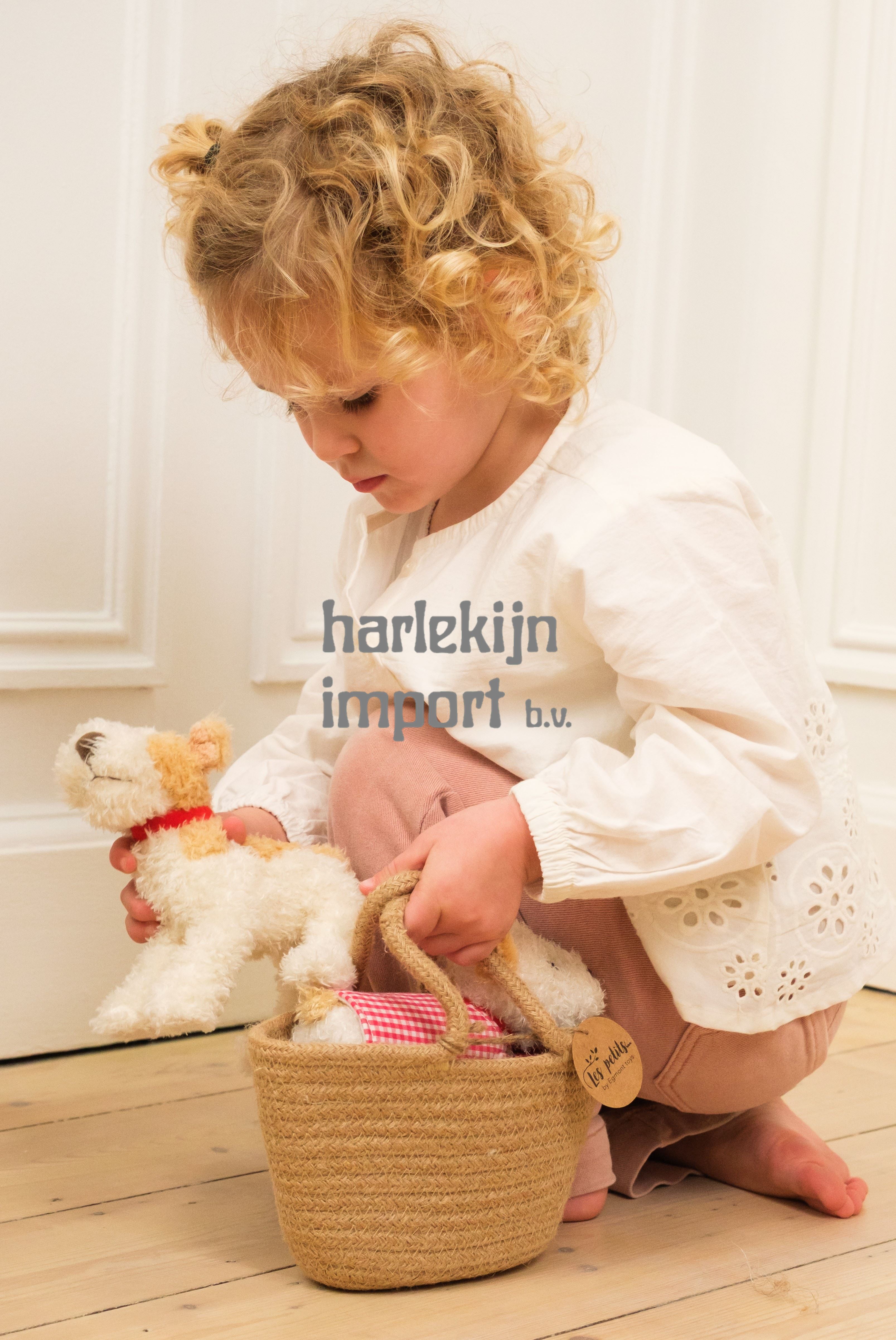 Knuffel: Eliot klein met riem & jas in mandje. 18 x 10 x 11 cm. 0+