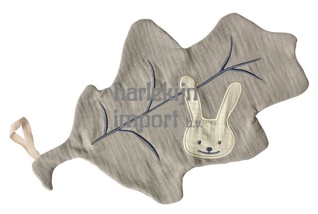 Het kleine konijntje komt uit zijn verstopplaats in het blad. Heel zacht knuffeldoekje in dubbelgaas katoen om Celestine te troosten wanneer ze triestig is. Een knuffel is een onmisbaar transitioneel object om de link te maken tussen de familie en de buitenwereld. erg praktisch is het lintje om een fopspeen te bevestigen.