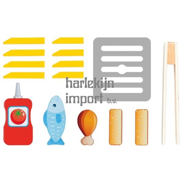 Houten accessoires: 1x rek, 1 x houten tang, 1 x vlees, 1 x vis,