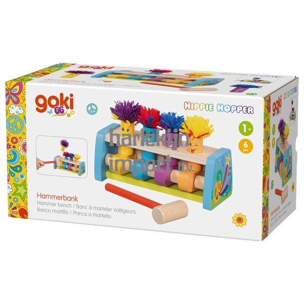 Kleurrijk, vrolijk en vol beweging: De "Hippie Hopper" hamerbank uit de goki66-serie vermaakt kinderen met levendig spel en een speelse knipoog. "Wacht, zijn dat niet de Beatles? Als ik een hamer had, zou ik meteen meedoen. Met één stevige klap springt de figuur de lucht in, en ik probeer hem met mijn vrije hand te vangen." Het is deze zeer dynamische speelstijl die de hamerbank tot een echt hoogtepunt maakt in elke kinderkamer.