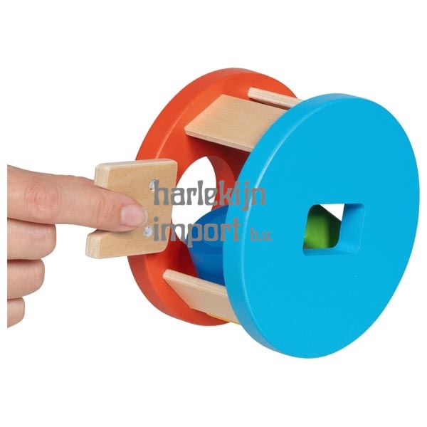 Deze sorteerdoos helpt kinderen zich te concentreren op de essentiële dingen, terwijl ze toch aandacht besteden aan het uiterlijk. Drie verschillend gevormde blokken moeten in de bijbehorende openingen van de houten kist worden gestoken. Omdat niet alle drie de openingen aan dezelfde kant liggen, verhoogt dit het moeilijkheidsniveau, maar het komt ook overeen met de logica van de wielvorm. Zodra de houten blokken correct zijn gesorteerd, kunnen ze veilig in het wiel worden opgeborgen of kan een nieuw spel beginnen. Om de blokken te verwijderen, trek je simpelweg de met rubber bevestigde poort omhoog. De vorm en het ontwerp van de ronde doos zijn bedoeld om verdere toepassingen in de kinderkamer te inspireren – en dat is precies het doel van dit houten speelgoed.