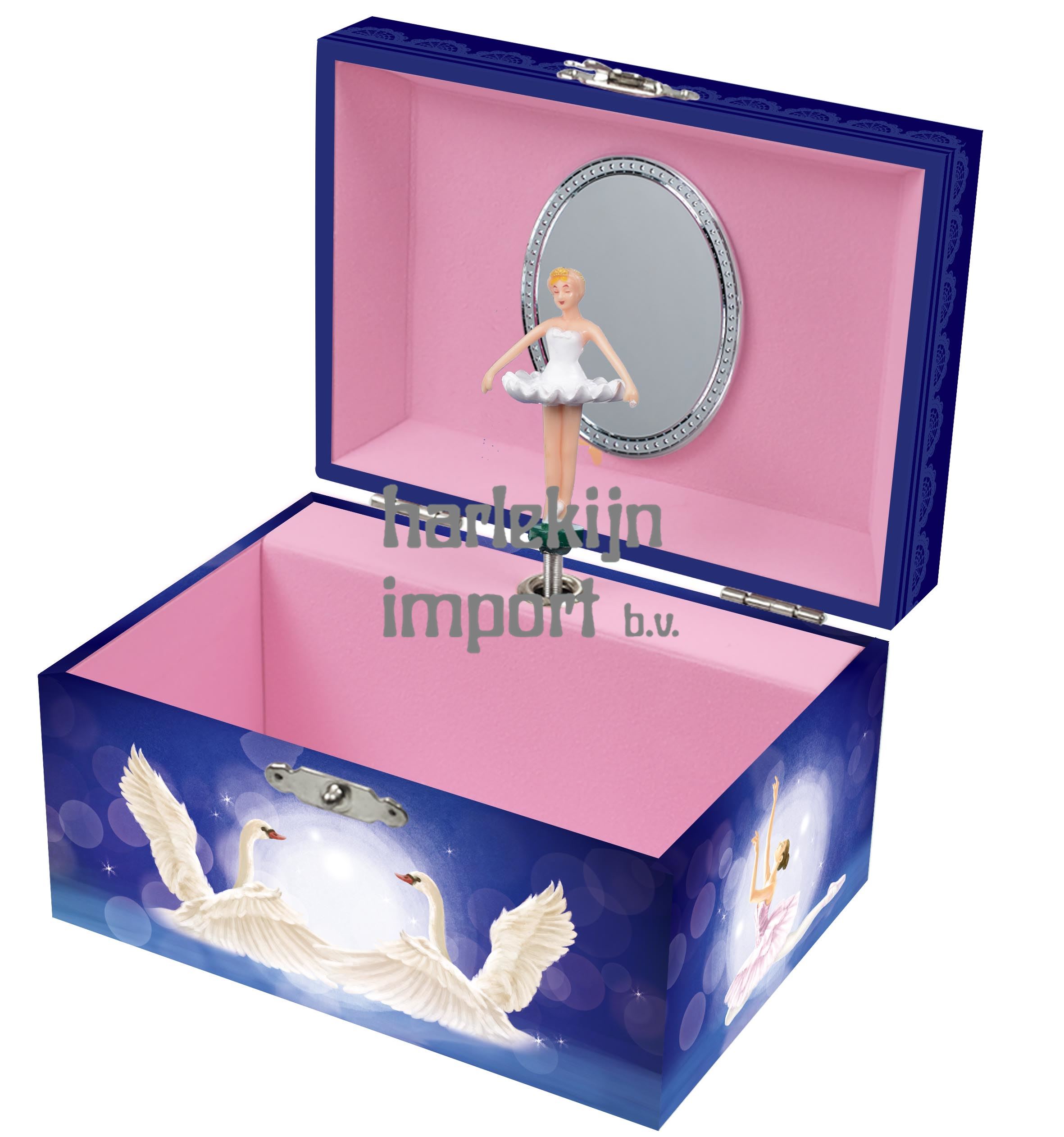 Juwelendoos - muziekdoos: Ballerina met zwanen. Figuur in doosje: Ballerina wit. Melodie: Swane Lake. 3+ |