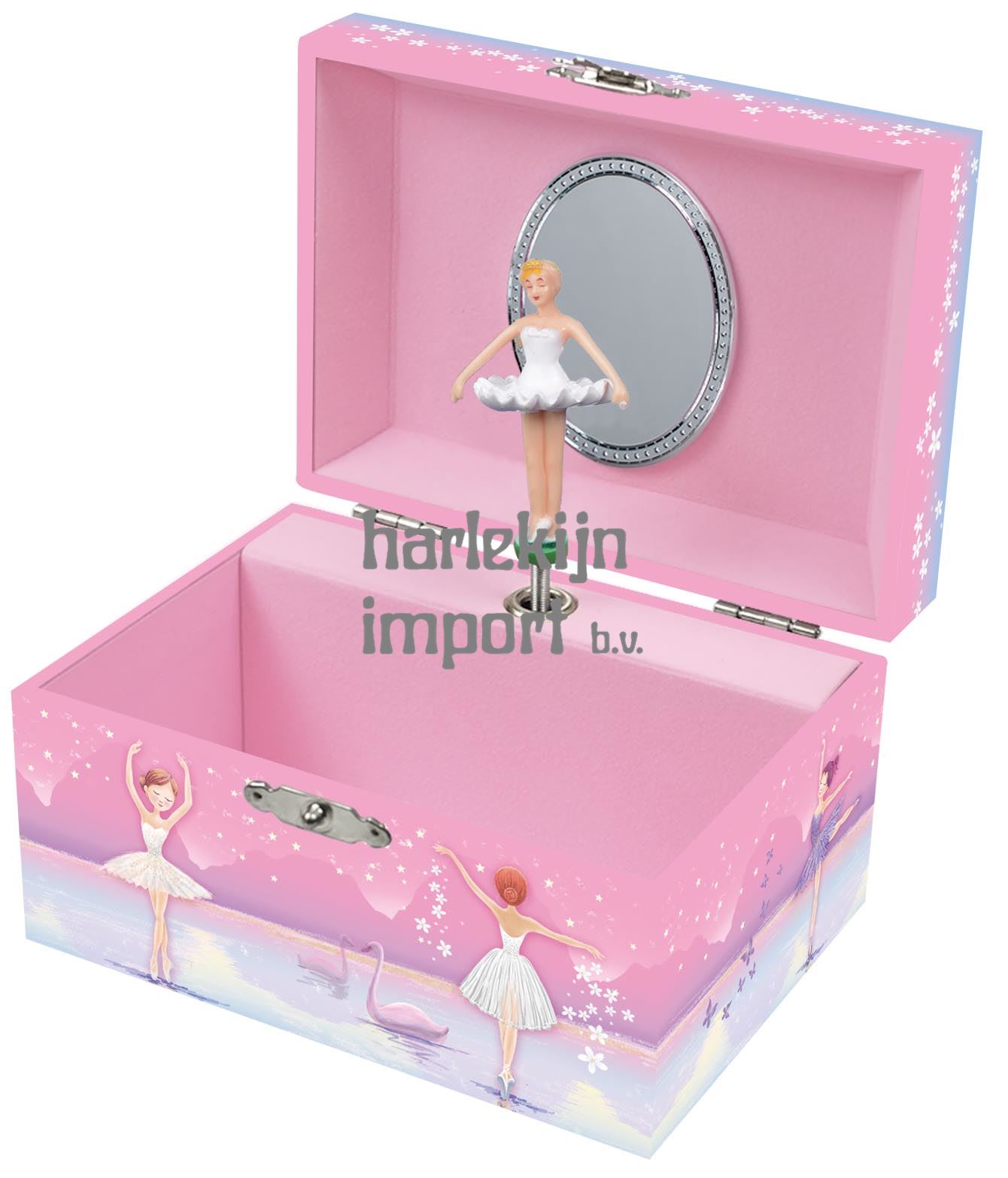 Description Juwelendoos - muziekdoos: Ballerina met zwanen. Figuur in doosje: Ballerina wit. Melodie: Twinkle Twinkle. 3+