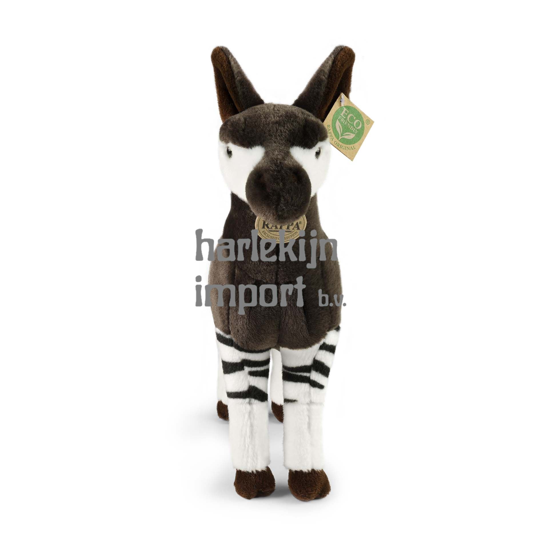 Pluche okapi meet 32 cm en behoort dankzij de materialen van de hoogste kwaliteit tot de Exclusive Collection pluche speelgoed van het merk Rappa. Dankzij de handgemaakte verwerking van elk stuk ziet het er ook levendig uit. Waarom het ECO-FRIENDLY label? Rappa is zich bewust van alle milieueffecten, richt zich op duurzaamheid en het minimaliseren van het gebruik van plastic. Daarom is de speelgoedvulling gemaakt van gerecyclede materialen, met name PET-flessen. Het is echter volkomen onschadelijk en geschikt voor kinderen vanaf de geboorte. LEUK WEETJE: Wist je dat, hoewel de okapi strepen heeft als een zebra, zijn naaste verwant de giraf is? Hij deelt er bijvoorbeeld een lange tong mee, waarmee hij zijn oren kan schoonmaken.