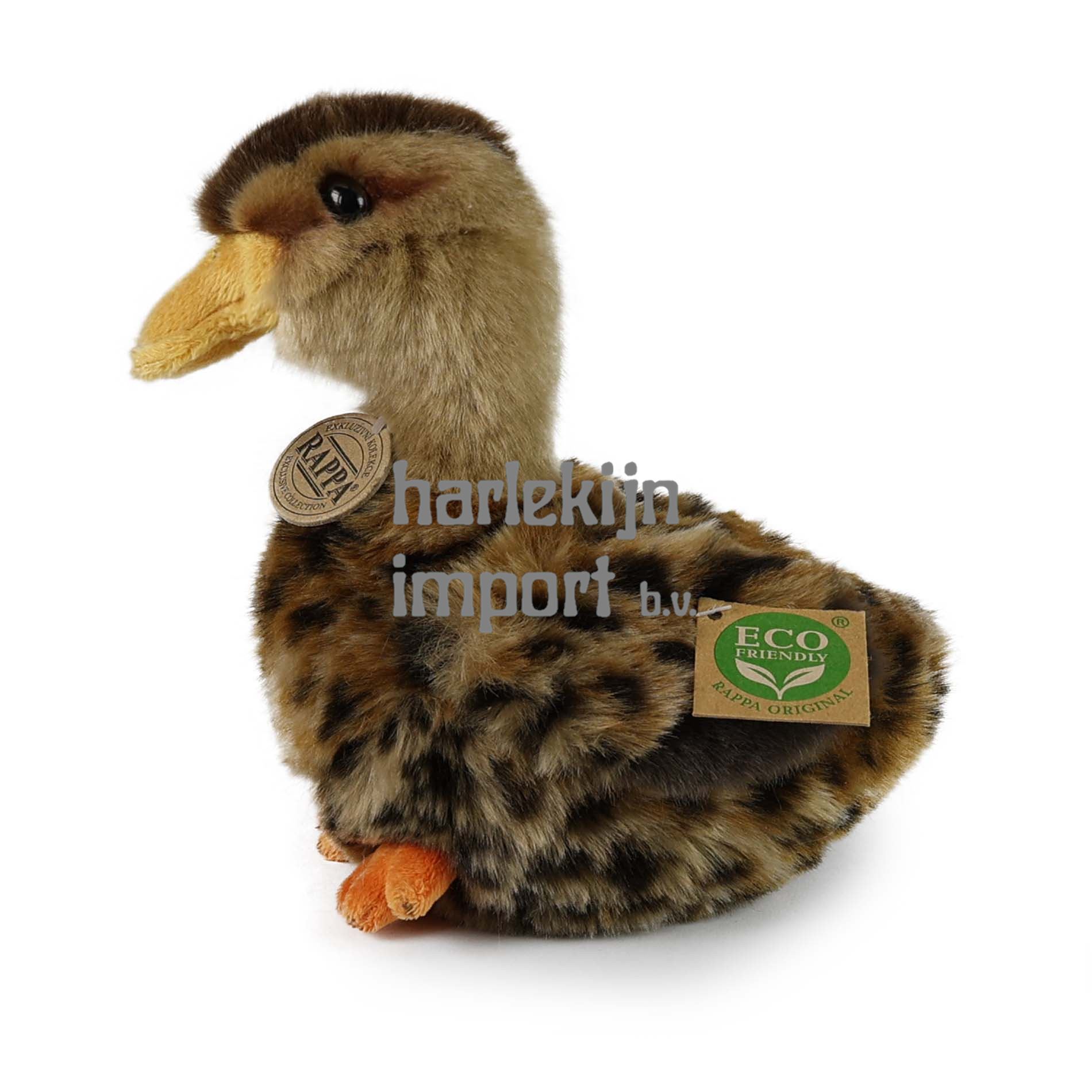 De pluche eend meet 19 cm en dankzij de hoogste kwaliteit materialen behoort hij tot de Exclusieve Collectie knuffels van het merk Rappa. Dankzij de handgemaakte bewerking van elk stuk ziet het er ook levendig uit. Waarom het label ECO-FRIENDLY? Rappa is zich bewust van alle milieueffecten, richt zich op duurzaamheid en het minimaliseren van het gebruik van plastic. Daarom is de speelgoedvulling gemaakt van gerecyclede materialen, vooral PET-flessen. Het is echter volledig onschadelijk en vanaf de geboorte geschikt voor kinderen. LEUK WEETJE: Wist je dat wilde eenden zelfs kunnen horen tijdens het slapen?