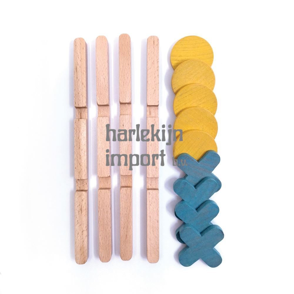 Exclusief gemaakt van beukenhout met niet-giftige coatings en niet-scherpe randen voor veilig spelen, wordt het geleverd in een retro ontworpen pakket met 10 houten kleurrijke tegels, 4 houten staven voor het raster die gemakkelijk kunnen worden gemonteerd en instructies voor 6 verschillende manieren van spelen. Geschikt voor kinderen van 6+ jaar.