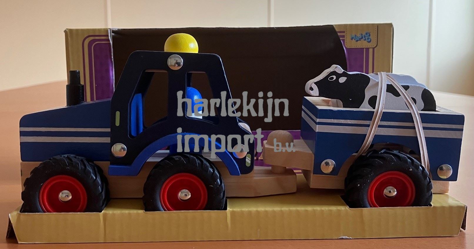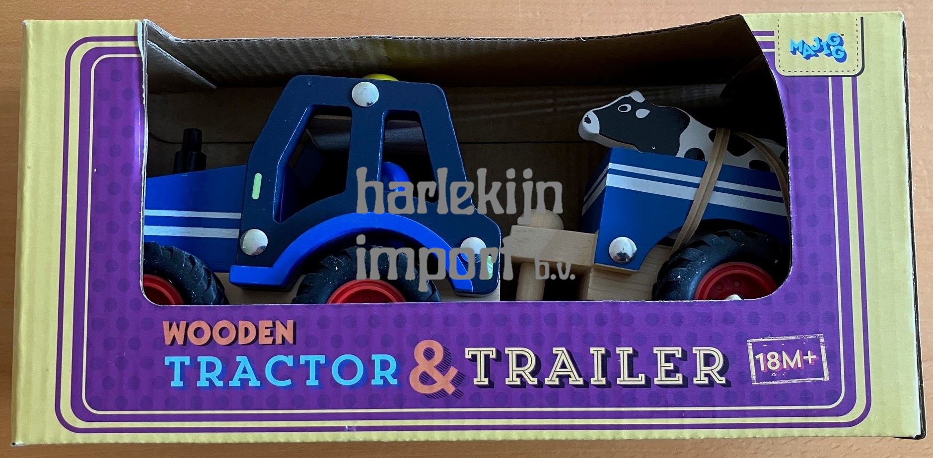 Retro Houten Tractor+trailer set. 2 assorti. rood en blauw. FSC. 2+ |